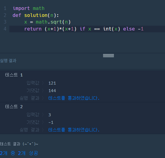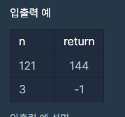 예시를 보면, 121은 11의 제곱이므로 x=11이 되어 (x+1)의 제곱, 즉 12의 제곱인 144가 return 되었습니다. 반면 3은 제곱수가 아니기에 -1이 return 되었음을 확인할 수 있습니다.