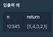 문제 - 자연수 n을 뒤집어 각 자리 숫자를 원소로 가지는 배열 형태로 리턴해 주세요. 예를 들어 n이 12345라면 [5,4,3,2,1]을 리턴합니다. 단, n은 10,000,000,000 이하인 자연수입니다. 입출력 예시는 아래와 같습니다.