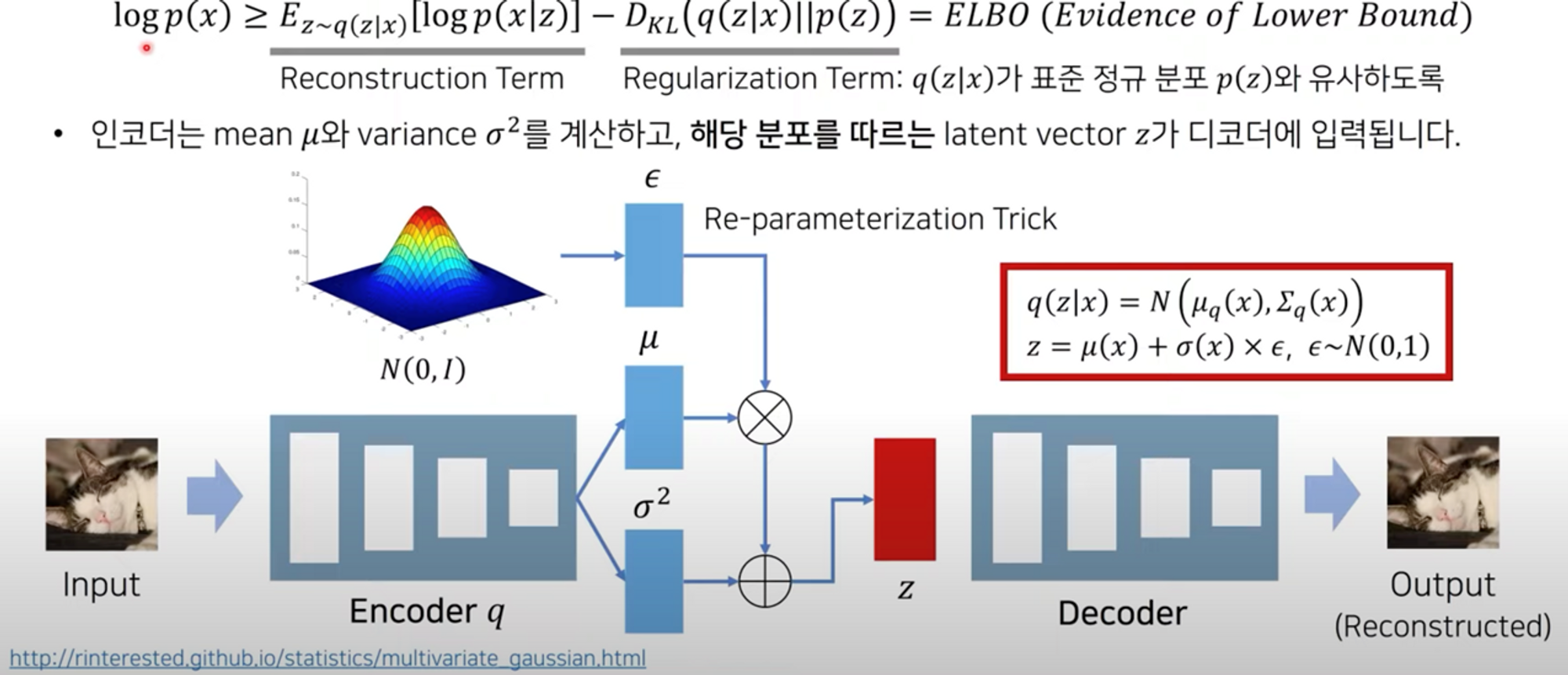 - Variational Auto Encoder는 Autoencoder 모델에서 latent vector $z$ 가 평균 $μ$와 분산 $σ^2$ 를 따르는 정규분포로 가정한 모델