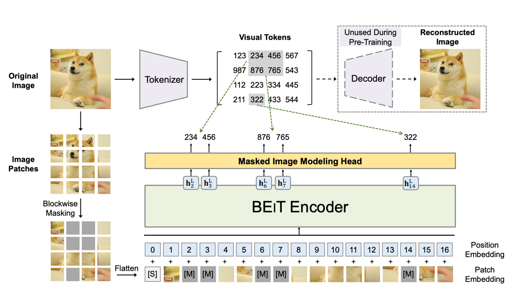 - 모델은 masked patches의 raw pixels 대신에, 원본 이미지의 visual tokens를 복원하는 것을 학습하게 된다.