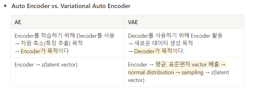 → 먼저 AE와 VAE의 동작 과정을 통해 latent vector z를 찾아내는 방법에서 차이점이 있음을 확인할 수 있다. AE는 단순히 차원 축소를 했다면, VAE는 데이터의 분포를 찾은 후 샘플링을 통해 z를 생성했음을 알 수 있다.