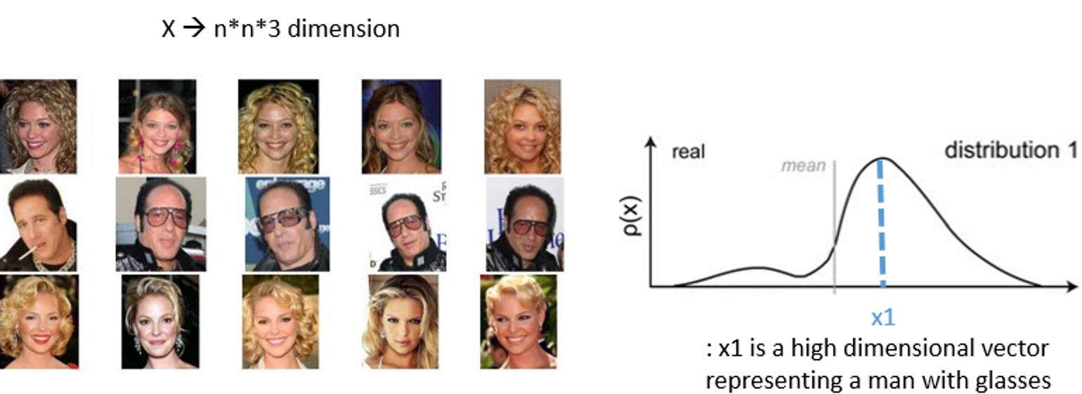 여기서 말하는 x는 이미지, 즉 n*n*3의 dimension을 가진 pixel들이 모여 매우 고차원의 x가 된다. 예시를 위해서 실제로는 매우 고차원의 x이지만, 1차원으로 생각해서 그래프(오른쪽)을 그려보면, 가장 높은 피크값이 데이터의 많은 부분을 차지하는 이미지를 의미하게 됨.