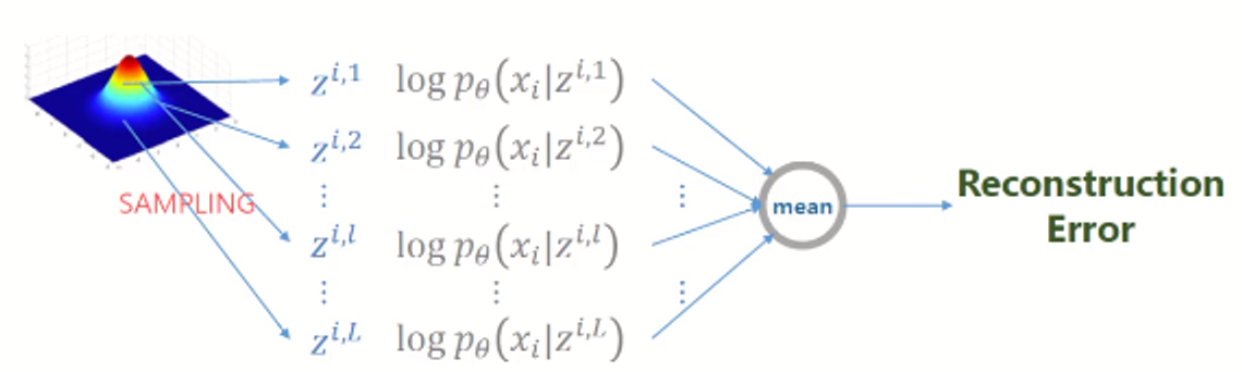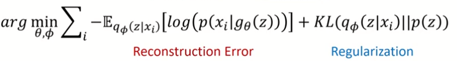 - Reconstruction Error : x가 Encoder(Φ라는 network) 지나서 z가 나오고, 해당 z를 Decoder(θ라는 network)에 넣었을 때 x가 나올 확률 maximize.