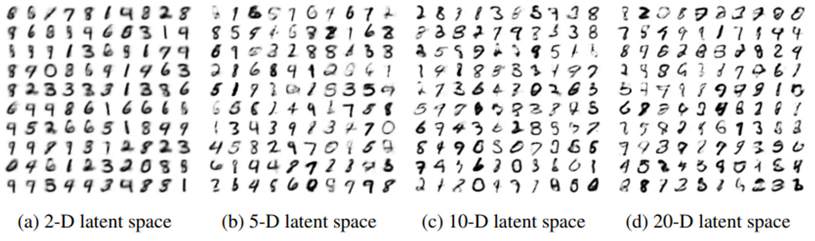VAE의 결과 사진을 통해서 더 큰 차원의 latent vector으로 축소를 했을 때 더 선명해진 것을 볼 수 있다. 하지만 너무 큰 차원의 latent vector를 사용하면 차원을 축소한 의미가 없어질 것.
