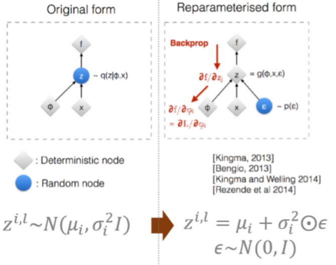 → 위에서 언급된 것처럼, sampling하는 과정은 미분, 즉 backpropagation이 불가능하다는 문제가 있기 때문에 Reparameterization Trick을 사용하는 것