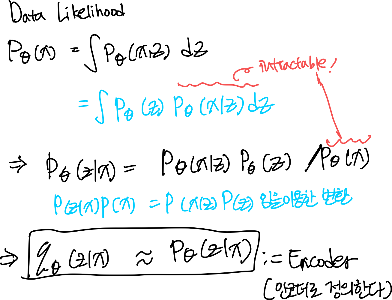 최대화 시켜야 할 Data Likelihood 식을 적어본 것이다. 그러나 디코더만으로 z에 대한 x를 뽑아내는 것에는 수식적으로 계산하기 힘든, intractable한 연산이 너무 많다(위 그림의 빨간 부분).