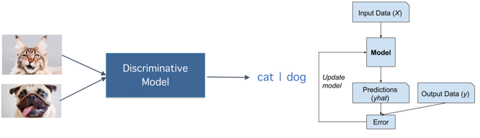 Supervised learning의 대표적인 모델인 discriminative model은 일반적인 classification task에 해당. input에 해당하는 클래스를 맞추기 위해, 클래스가 🐱인지, 🐶인지를 구분하기 위해서 학습하게 되며 모델을 학습하고 loss를 구하기 위해 실제 label이 사용된다.