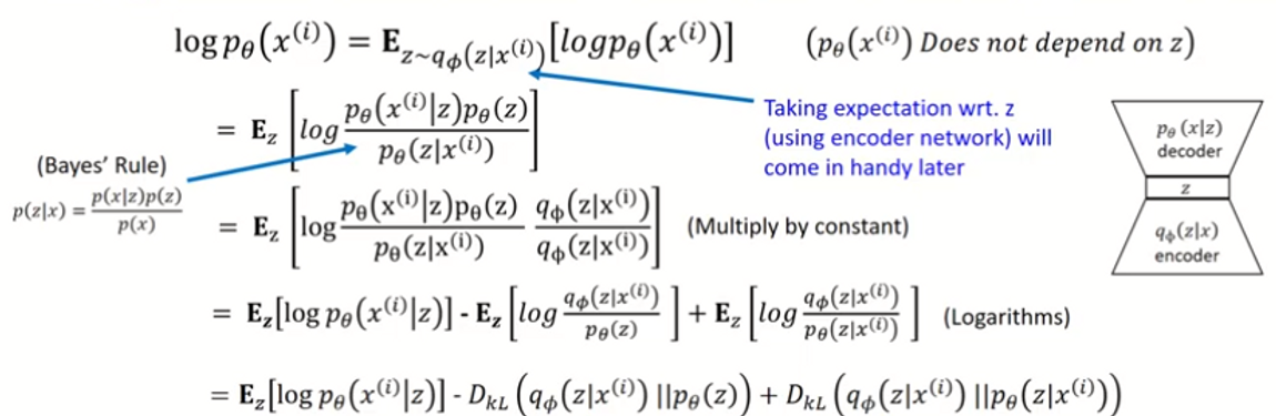 - p(x)의 최대를 구하기 위해 log(p(x))의 최대를 구해도 됨→ z가 encoder의 q(z|x) distribution을 따를 때 log(p(x))의 기대값을 구함 → 베이즈 정리 + 수식 계산 → KL divergence 형태로 나타냄