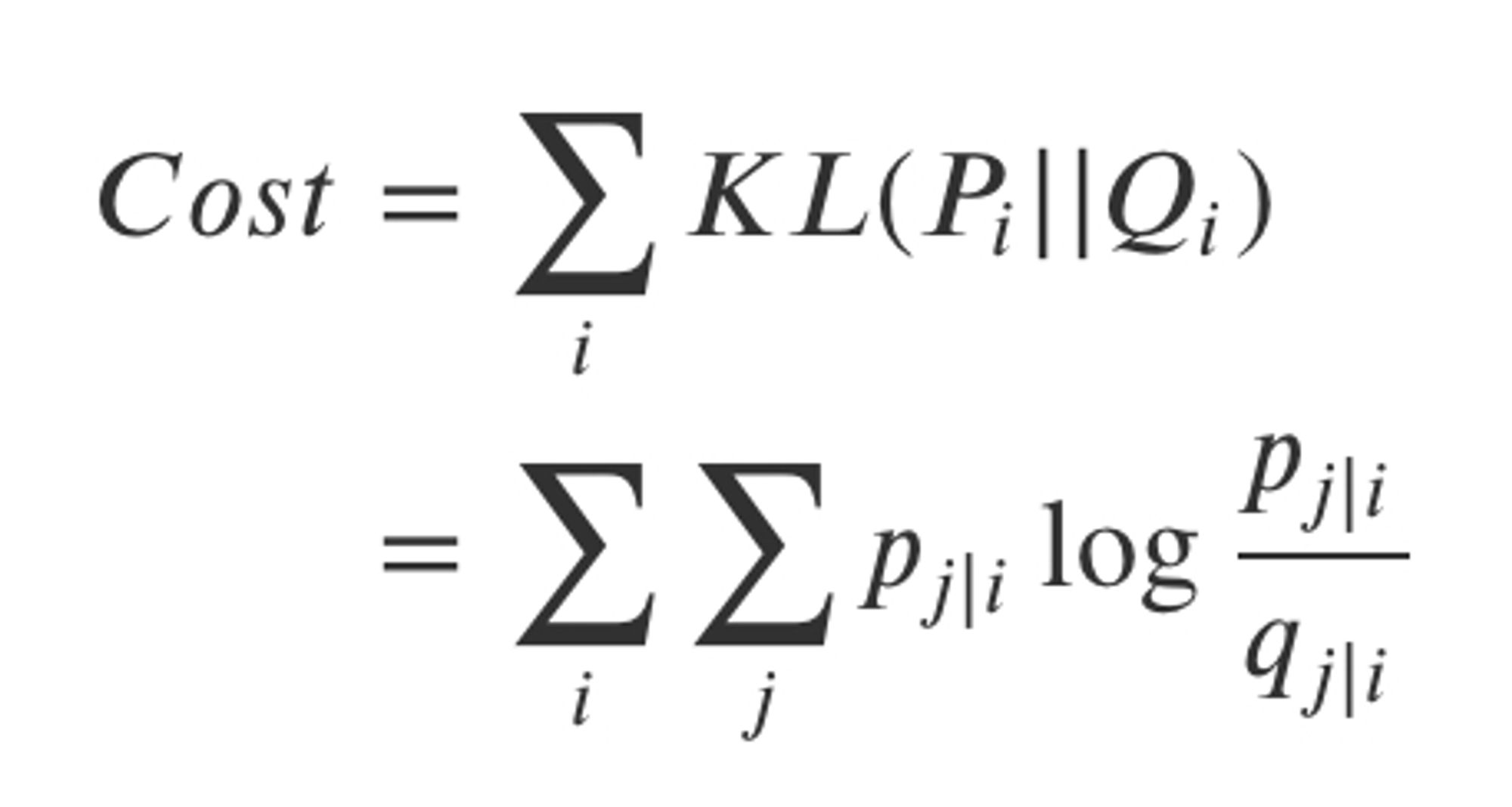 - 즉, p와 q가 유사할수록 차원축소가 잘 되었다고 볼수 있다. 이를 수학적으로 계산하기 위해 다음 식을 이용한다.
