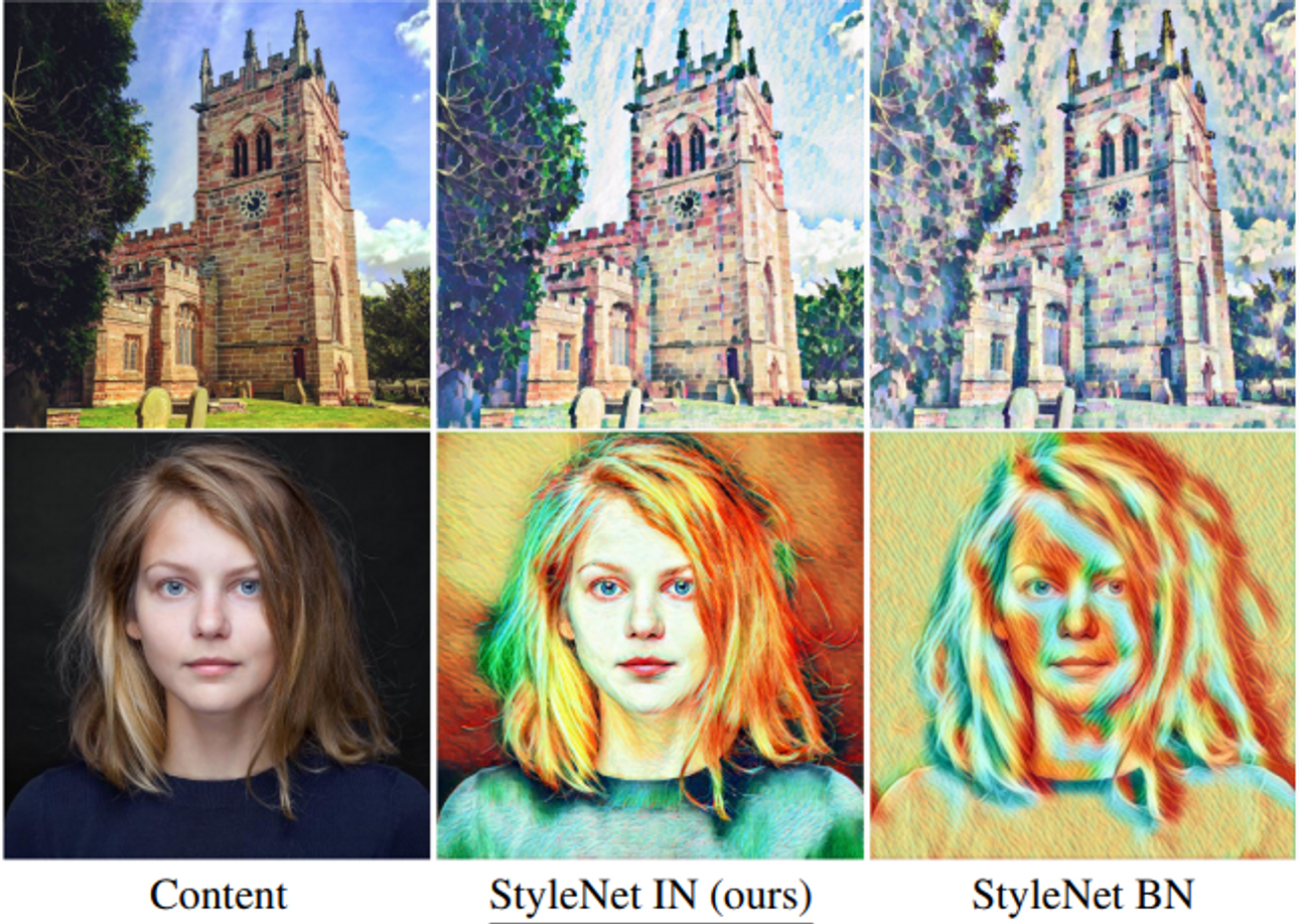 "IN (instance normalization)은 image의 feature statics를 normalization하여 style variantion을 제거하는 효과가 있으며 style transfer에서 BN (batch normalization) 또는 LN(layer normalization)보다 자주 사용된다. 그러나 image를 normalization 할 때 최근 연구에서는 IN만 사용하는 대신 adaptive instance normalization (AdaIN), conditional instance normalization, 및 batch instance normalization을 사용한다." (https://arxiv.org/abs/1907.10830에서 발췌)