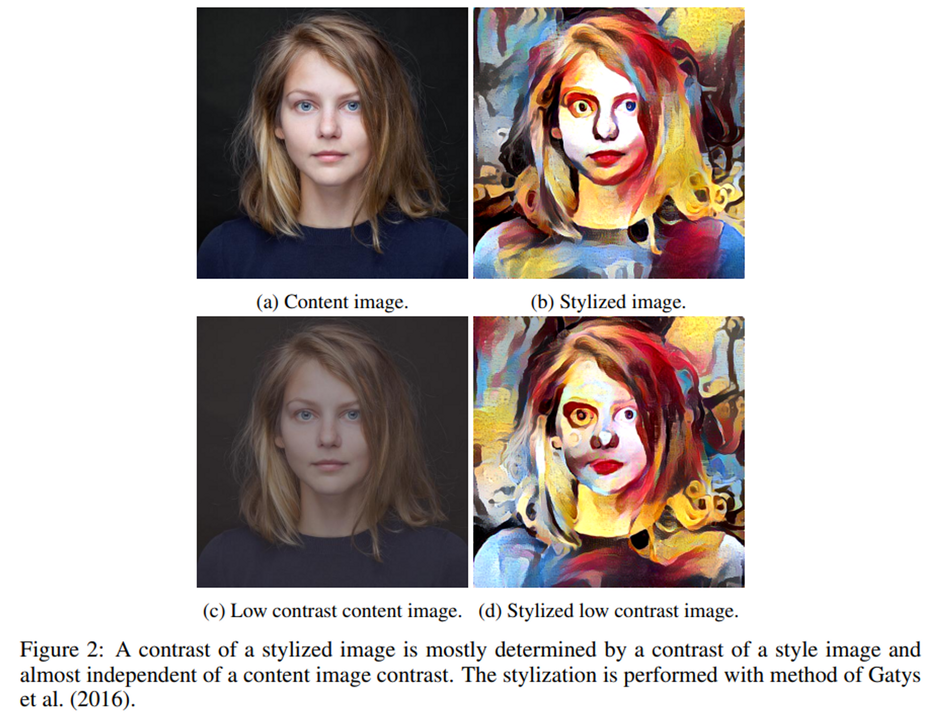 stylized image의 contrast는 대부분 style image의 contrast에 의해 결정되며 content image contrast와 거의 독립적이라는 것을 아래 이미지에서 확인할 수 있다.
