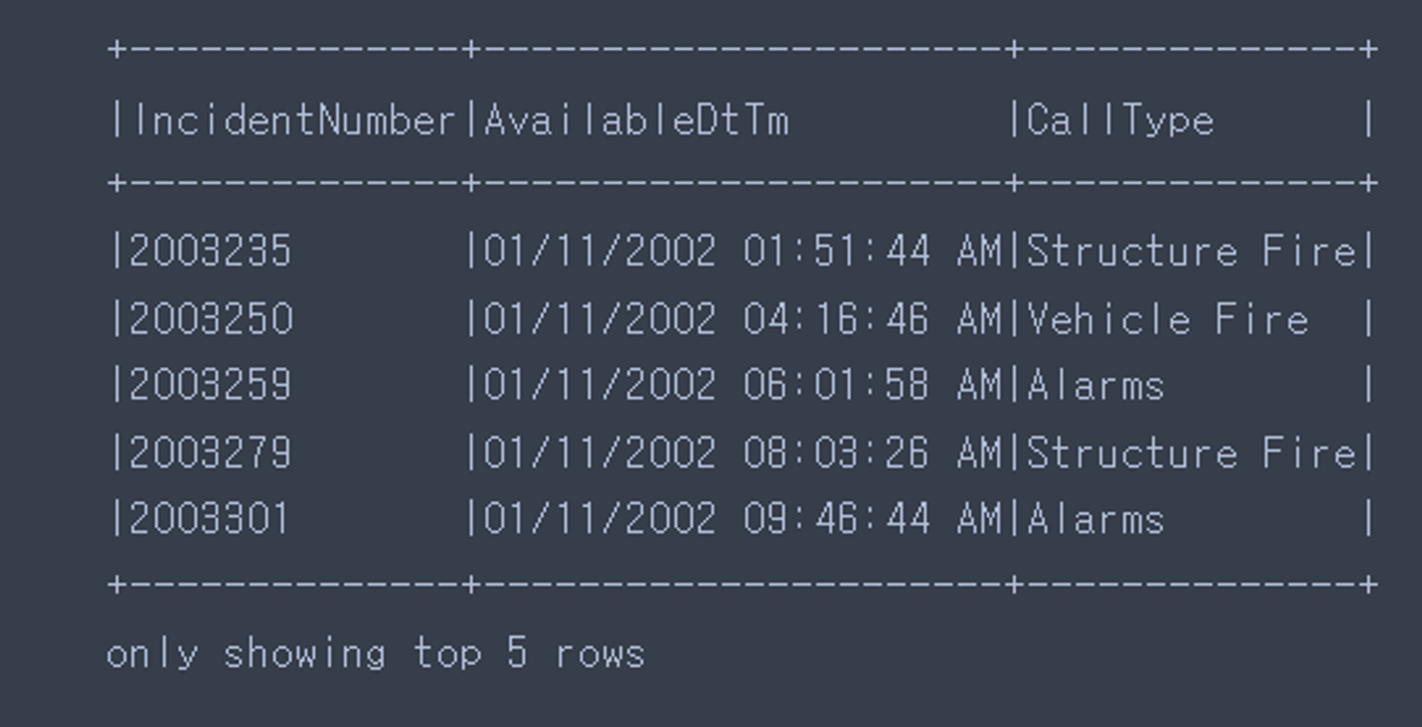 .select(“IncidentNumber”, “AvailableDtTm”, “CallType”)