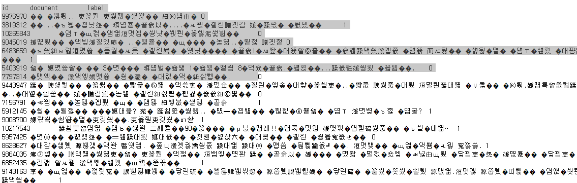 이때 encoding에 주의해야 한다. 아니면 아래와 같이 깨져버린 dataset을 보게 될 것이다...