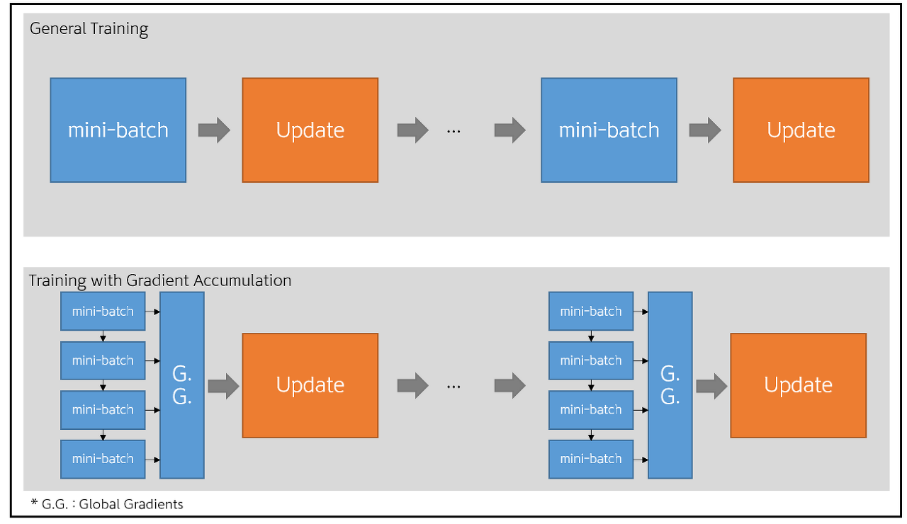 학습률을 조정하는 코드이고, 아래는 Gradient Accumulation(옵션이다)을 조정하는 코드다. Colab 상에서 코드를 실행할 때, 가장 중요해지는 건 무료라는 전제 하에 어디까지 돌려볼 수 있는가? 가 아닐까 싶다. 이를 조정하기 위한 방법이 gradient accumulation이다. 구글링 결과 나온 이미지로 설명해 보자면 아래 그림과 같다. G.G(Gradient accumulation) 단계를 추가하여, 우선 각 미니 배치 훈련 후 한번에 업데이트시킨다는 차이가 있다.