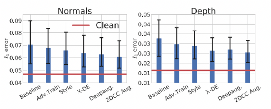 그림 6은 surface normal과 depth estimation task를 위한 3DCC에서의 각기 다른 robustness mechanism들의 평균 성능을 보여준다. 이러한 메커니즘들은 standard 보다 성능이 향상되었으나 clean에 비하면 여전히 부족!