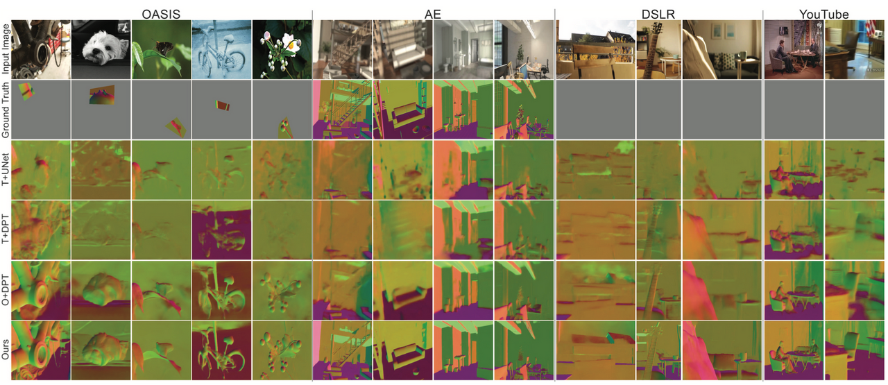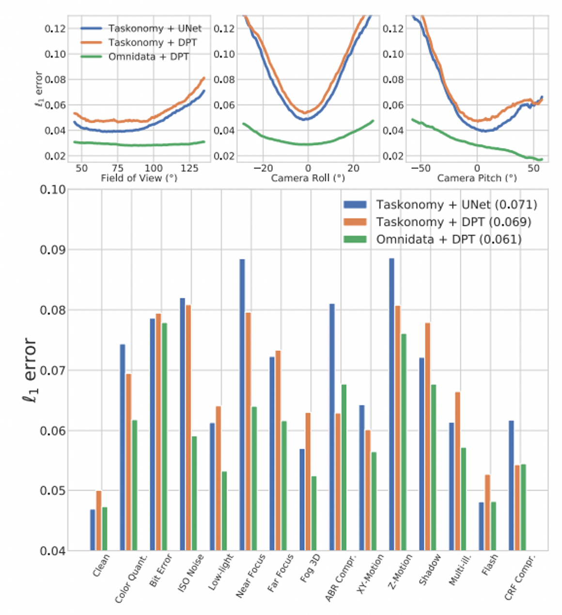 본 논문에서는 Taskonomy 데이터를 학습한 UNet과 DPT 모델을 활용하며 이를 T+UNET, T+DPT라 하며, Omnidata를 학습한 DPT를 O+DPT라 합니다. 이를 통해 데이터셋과 모델 구조의 효과를 보인다.