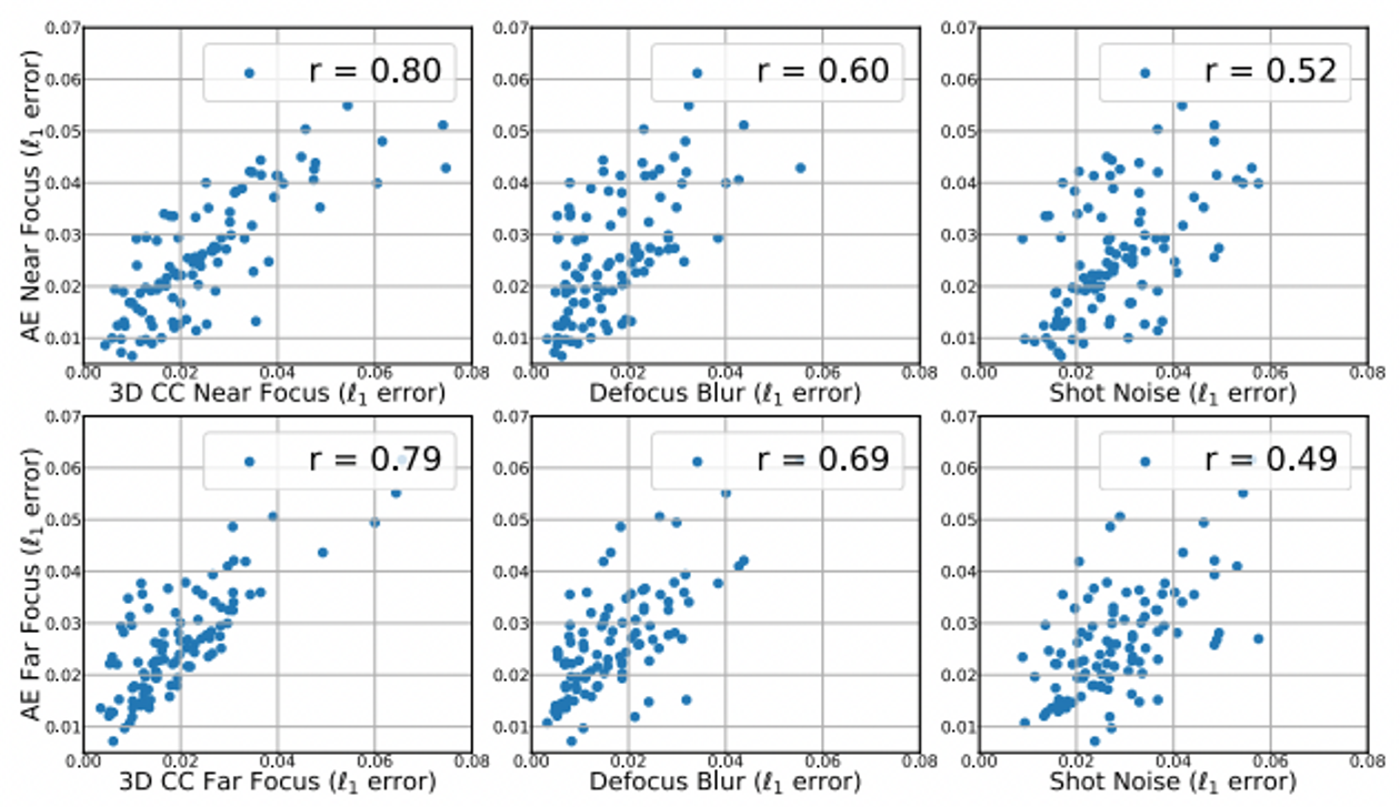 왼쪽 그림에서 3DCC와 2DCC 사이 유사성을 corrupted surface normal estimation prediction의 L1 error 상관관계를 통해 정량화한 것을 보여주며, 그림 8의 오른쪽은 corrupted image 사이 L1 error를 계산해 RGB 도메인에 대해 동일한 분석을 실행한 결과 3DCC가 더 낮은 상관관계를 산출한다는 것을 볼 수 있다.