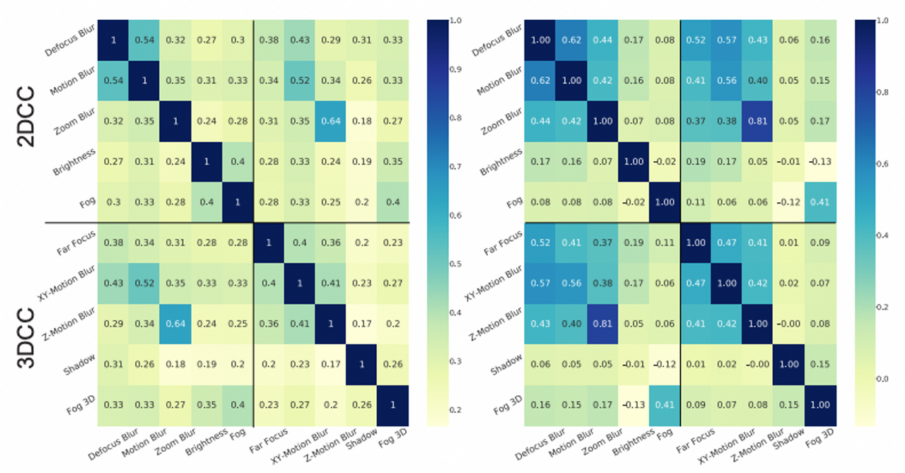 이에 따르면 3DCC는 벤치마크 내 뿐만 아니라 2DCC에 대해서도 상관관계가 적다. 따라서 3DCC의 다양한 corruption은 각각의 augmentation이 커버하는 범위가 다름과 동시에 기존의 2DCC와 중복되지 않음을 알 수 있음.