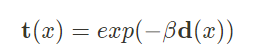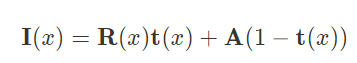 A는 자연광이며,t(x)는 카메라에 도달하는 빛의 양이다. 전달 매체가 균일할 경우 빛의 세기는 카메라 거리에 따라 달라지게 되며, 수식으로는 아래와 같습니다.