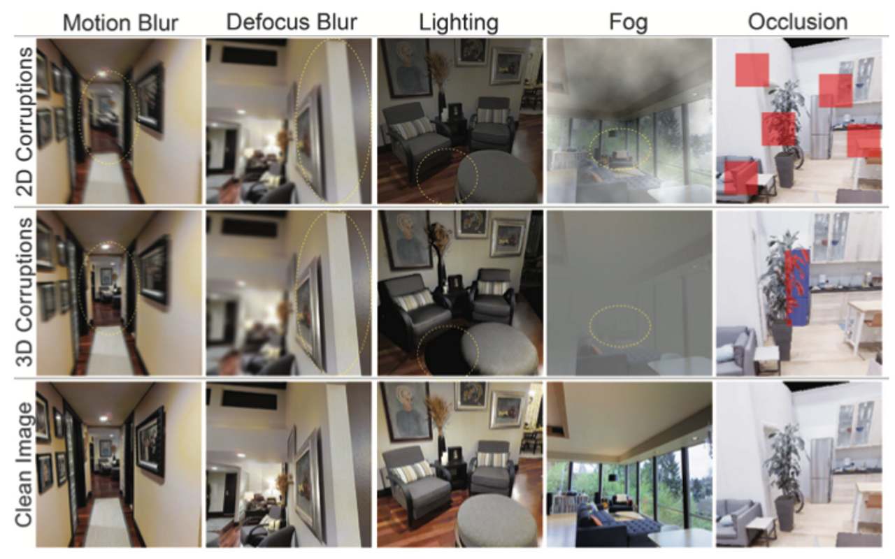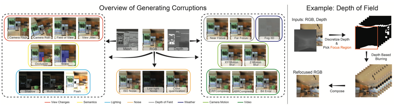 depth of field, camera motion, lighting, video, weather, view changes, semantics, noise 등을 정의해 3DCC에서 20개의 corruption을 만들었을 때, 대부분의 corruption들은 rgb image와 depth를 필요로 하며, 몇개는 3D mesh를 필요로 한다.