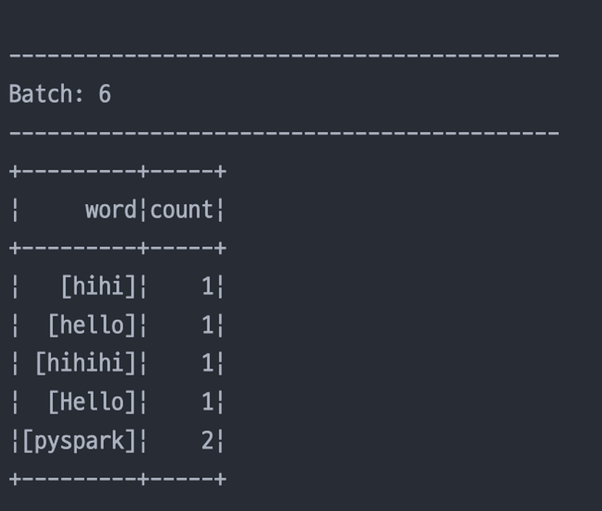 - counts 변수는 실행 중인 단어 세기 프로그램을 나타내는 ‘스트리밍 데이터 프레임’이며 한번 스트리밍 쿼리가 시작되고 스트리밍 입력이 지속적으로 처리되면서 계산을 수행하게 됨