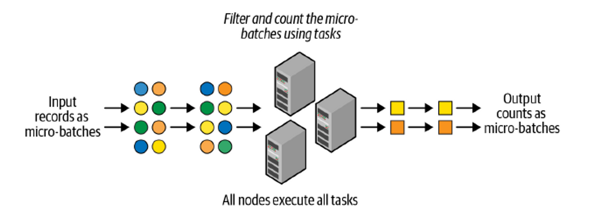 - 입력 스트림에서 데이터를 잘게 쪼개어, 각 배치는 분산 처리 방식으로 스파크 클러스터에서 각 마이크로 배치의 결과를 생성하는 작은 태스크들을 실행