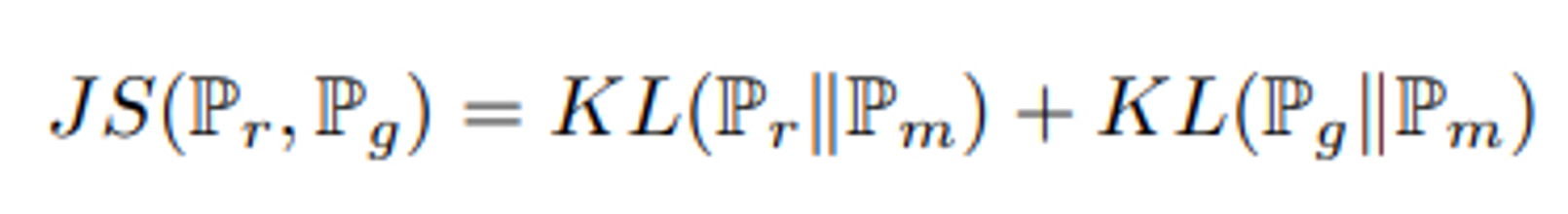 - Jensen-Shannon Divergence(JSD) : 분포들이 겹치지 않을 경우 발산하지는 않지만 상수인 log2로 고정되어버려 "얼마나 먼지"에 대한 정보를 줄 수가 없음 (상수값이므로 미분시 0 → 역전파를 통한 업데이트 x)
