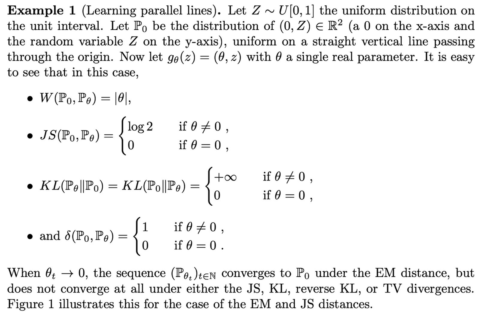 결론적으로 위에서 나왔던 Distance들은 두 분포가 서로 겹쳐지는 경우에는 0, 겹치지 않는 경우에는 무한대 또는 상수로 극단적인 거리 값을 나타내게 됨. 이는 discriminator와 generator가 분포를 학습할 때 위 세가지 distance를 기반으로 학습하게 된다면 학습에 어려움이 많다 라는 것을 의미함.