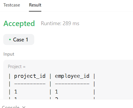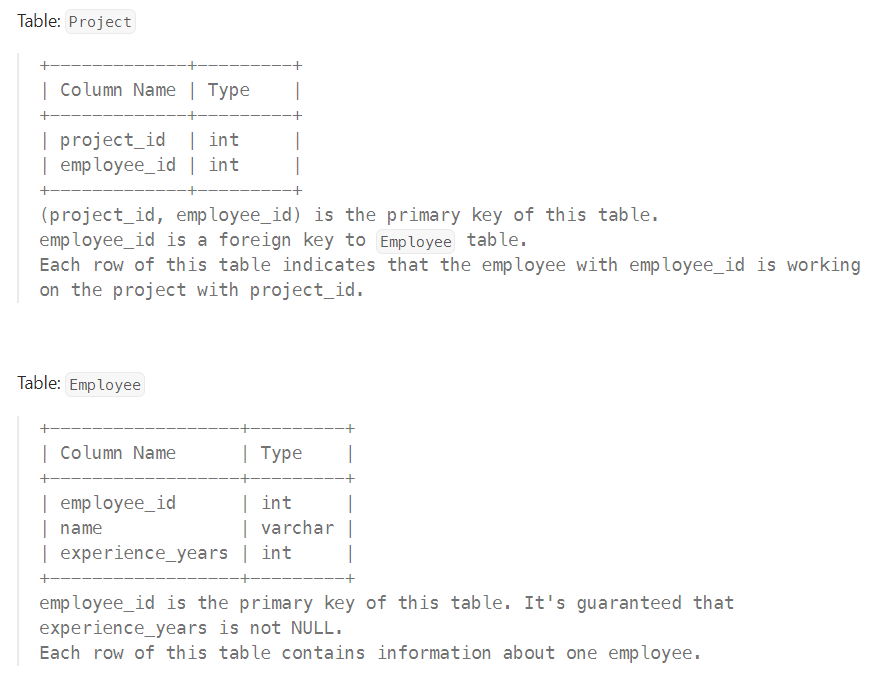 Can you solve this real interview question? Project Employees I - Table: Project +-------------+---------+ | Column Name | Type | +-------------+---------+ | project_id | int | | employee_id | int | +-------------+---------+ (project_id, employee_id) is th