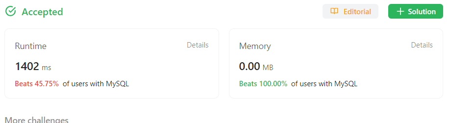 결과도 good :) 다만 SQL은 도대체 어떻게 하면 이른바 '클린코드'를 작성할 수 있는지 잘 모르겠다 ... beats 45.75%는 좀 아쉬운디