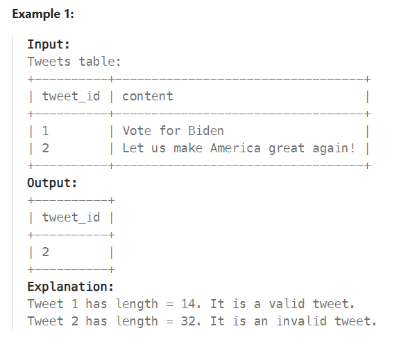 Write a solution to find the IDs of the invalid tweets. The tweet is invalid if the number of characters used in the content of the tweet is strictly greater than 15.