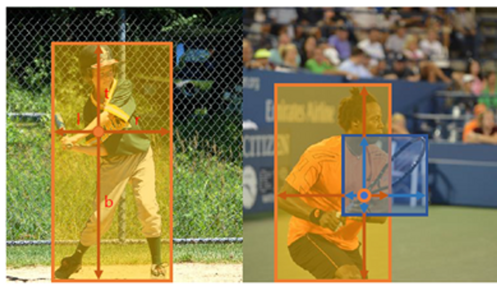 - 어떤 포인트가 예측되면 그 포인트와 실제 ground truth와의 거리(즉 왼쪽 사진에서 t,l,r,b)를 학습하여 예측하는 방식.