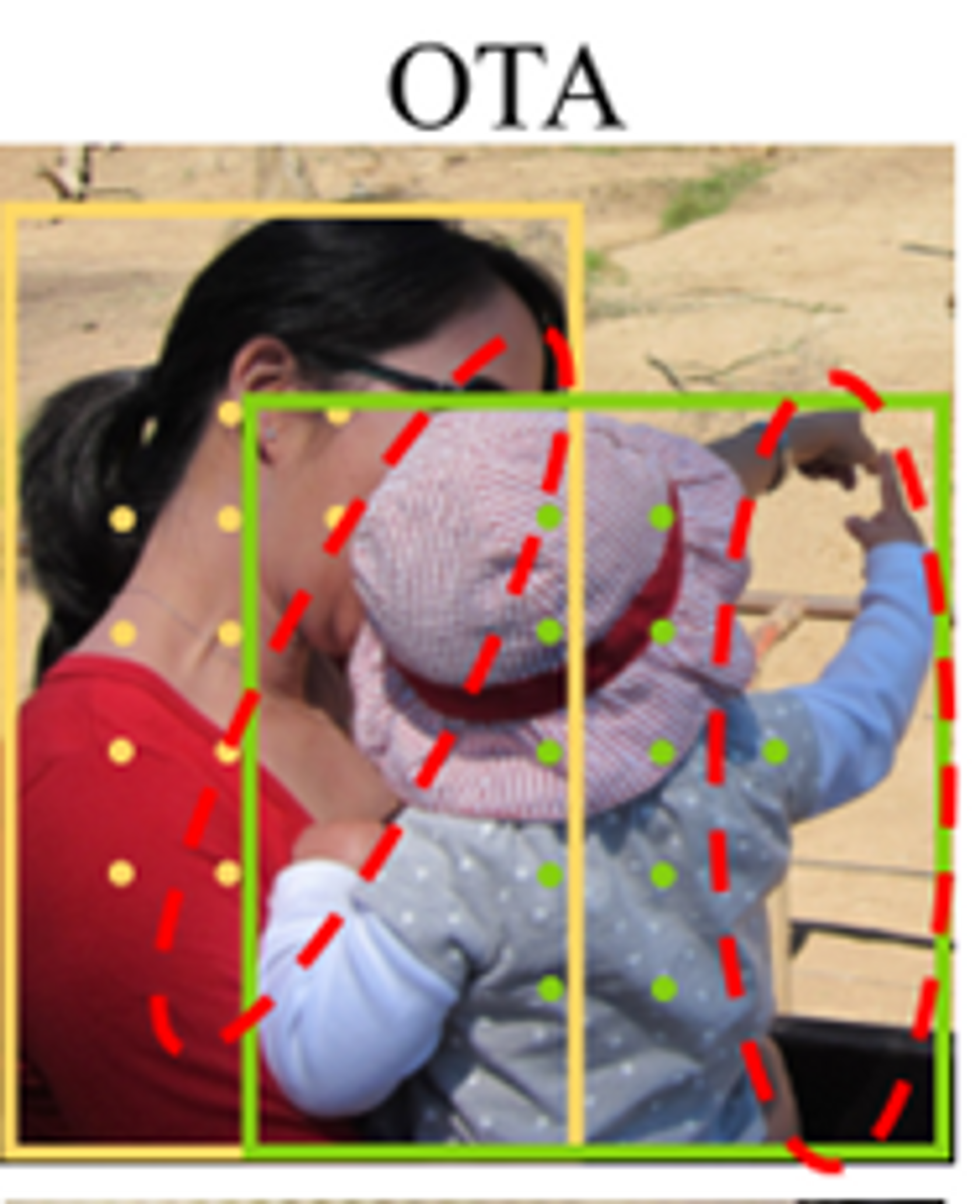 OTA(Optimal Transportation Algorithm)는 위처럼 optimal을 찾는 최적화 문제를 푸는 것인데, 아래 사진에서 붉은 점선처럼 아이인지 엄마인지 labeling이 애매한 부분을 cost plane을 사용해서 최적화시킨다. 그리고 이 OTA를 iteration없이 simple하게 적용한 것이 simOTA로 아래 cost function을 사용한다.