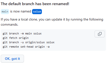 깃헙 디렉토리 이름을 지을 때, main branch가 이미 생성된 것을 몰라서 결국 default branch rename을 통해 해결했다. main은 결론적으로 solux로 재명명했고, 아래와 같은 명령어를 통해 git bash를 실행시킬 수 있었다.