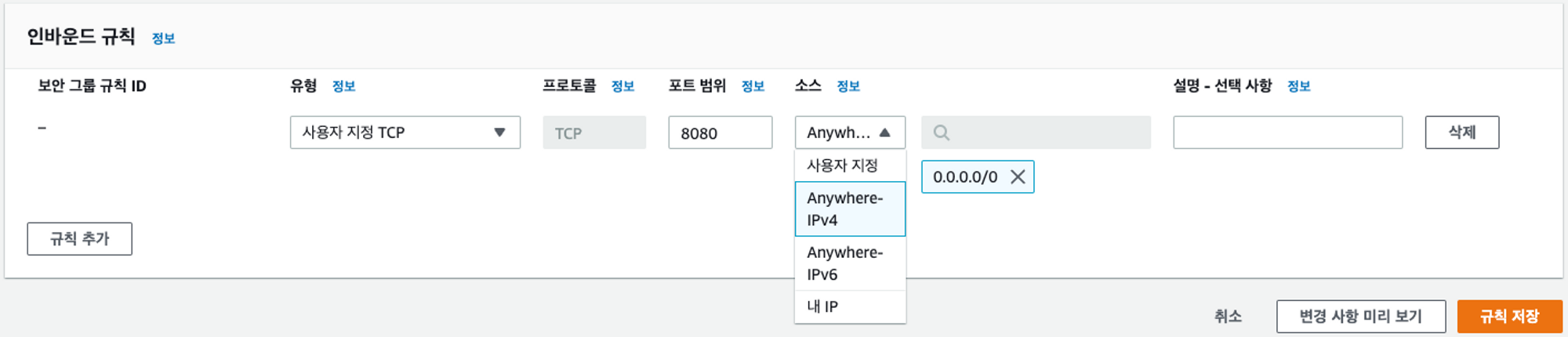 - 인바운드 규칙 편집 → 규칙 추가 → 아래와 같이 입력 후 → 규칙 저장