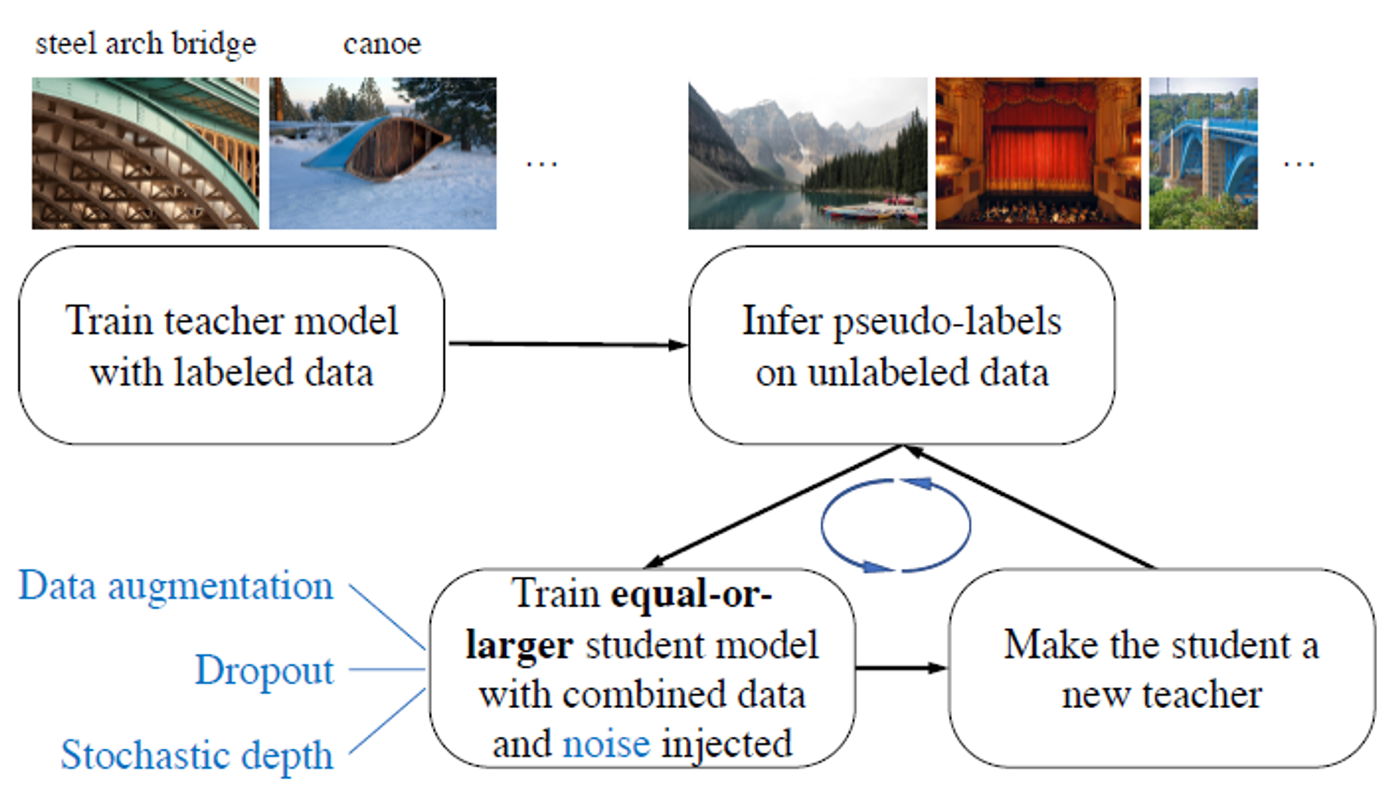 - Noisy Student는 teacher network와 같거나 더 큰 student network를 가지며, 학습하는 동안 student network에 noise를 주입한다.