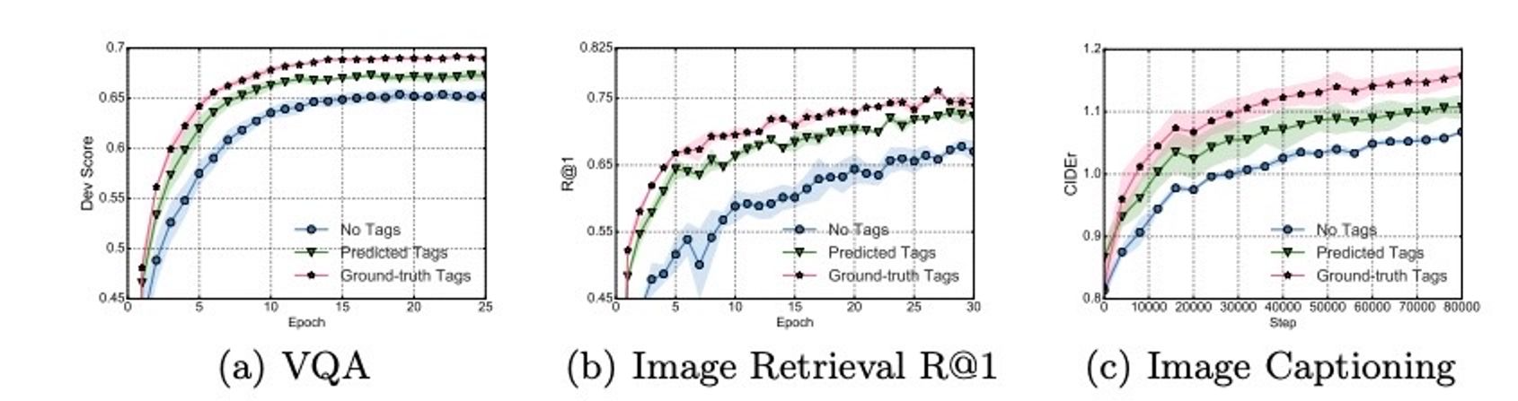 맨위의 제일 성능이 좋은 것은 사람이 ground truth에서 직접 넣어준 다음 tag를 찾은 결과, object detection으로 tag를 찾을 때, tag 자체를 사용하지 않을때 순서대로 성능이 나온 것을 확인할 수 있다.