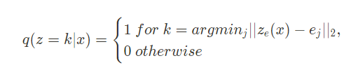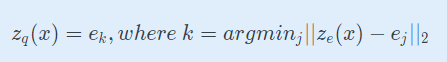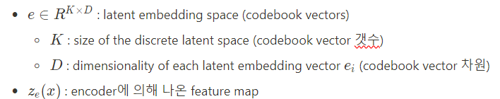 - encoder output z_e(x)의 k번째 vector와 L2 distance가 최소로 되는 j번째 codebook vector e_j가 존재할 때, 1, 나머지는 0으로 one-hot encoding.