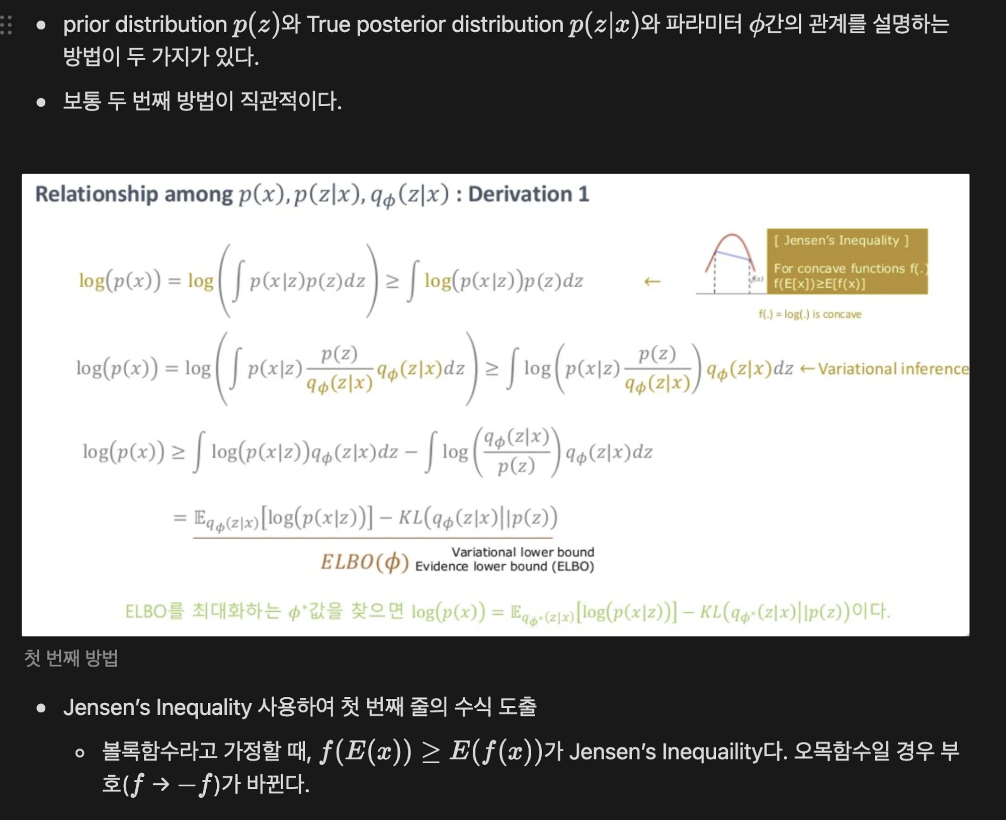 - Jensen’s inequality는 VAE에서 p(z), p(z|x), q_ φ (z|x)간의 관계를 설명하여 ELBO term을 유도할 때 사용했다.