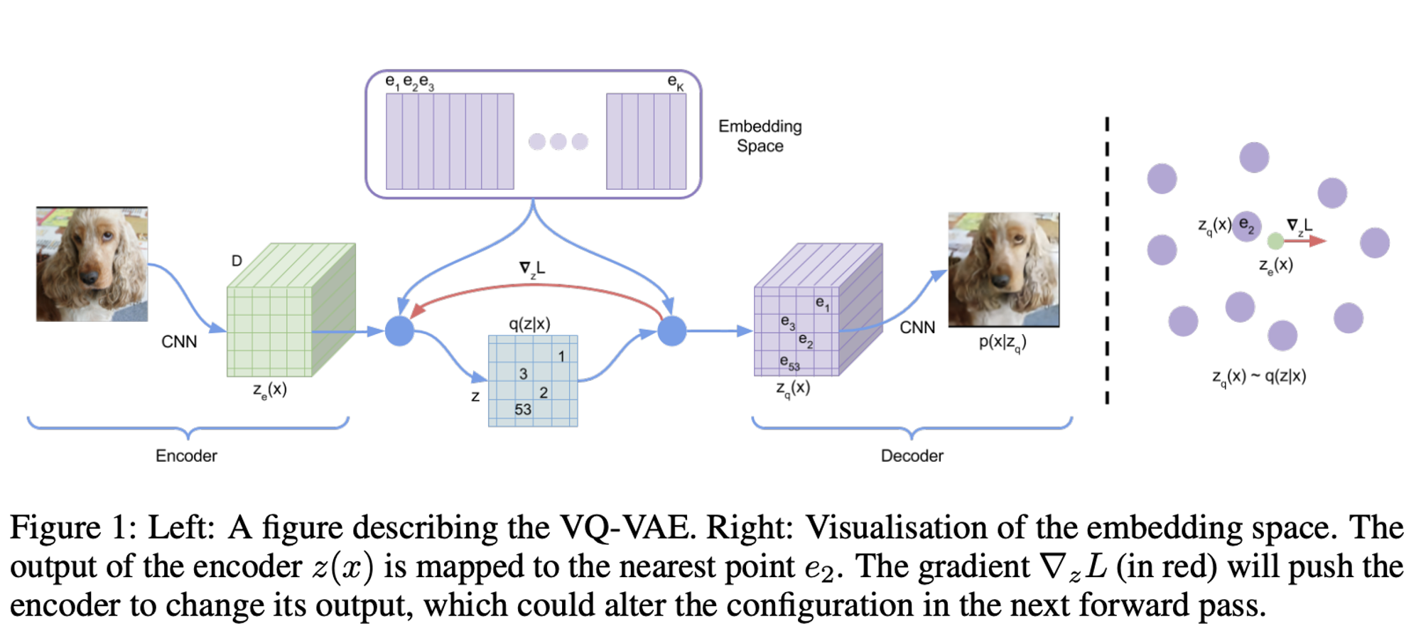 - discrete latent variables z는 embedding space e에서 nearest neighbour look-up을 통해 계산된다.