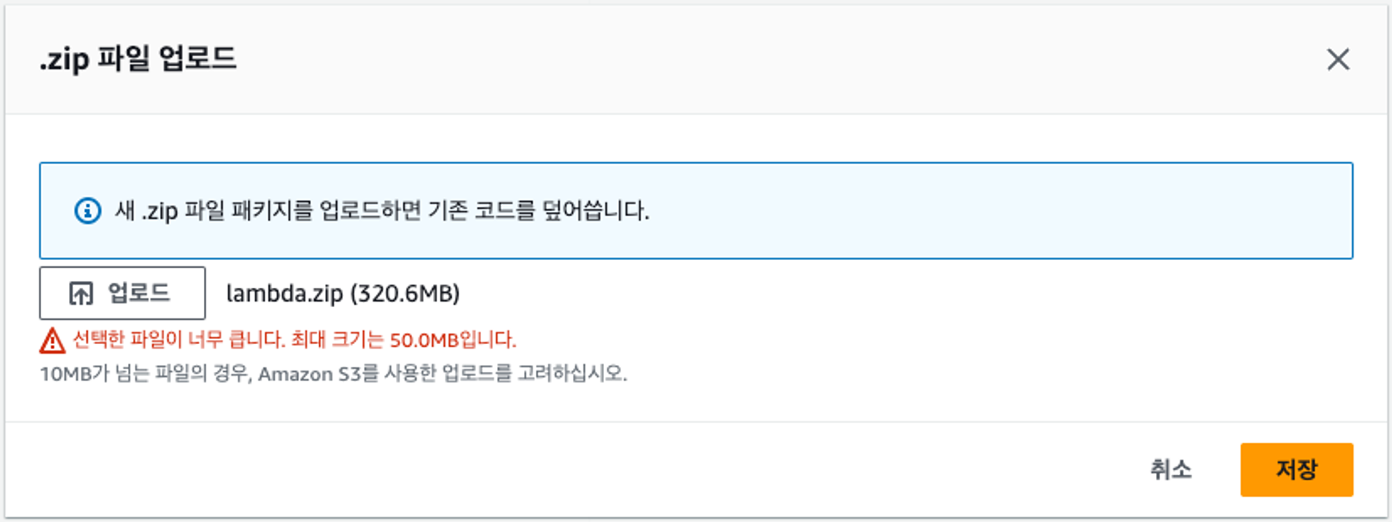 S3 파일 업로드 사이즈 제한 : 생성한 zip 파일의 크기가 320MB 이기 때문에 불가