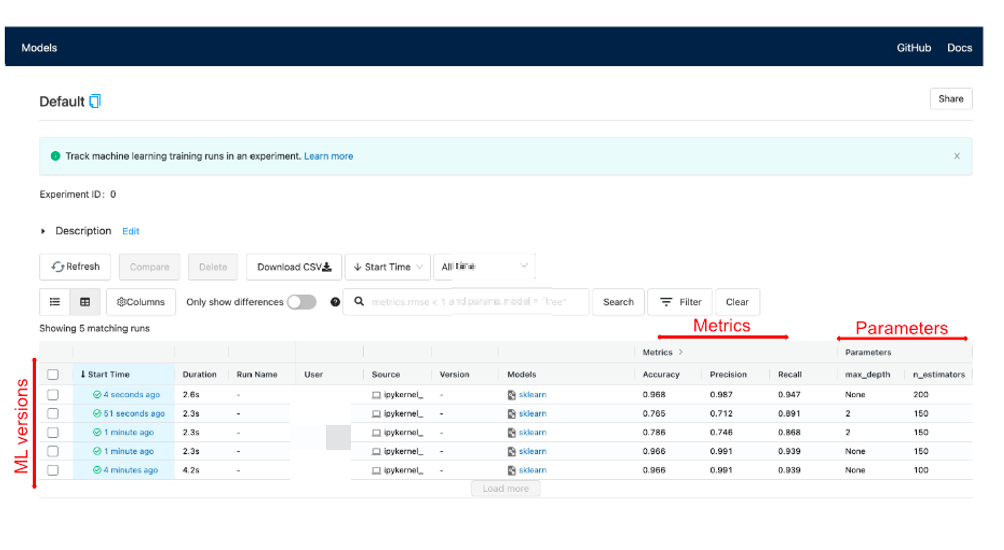 - 트래킹(Tracking): 매개변수, 메트릭, 코드 버전, 모델 그리고 plot 및 text와 같은 아티팩트를 기록하는 API를 제공한다.