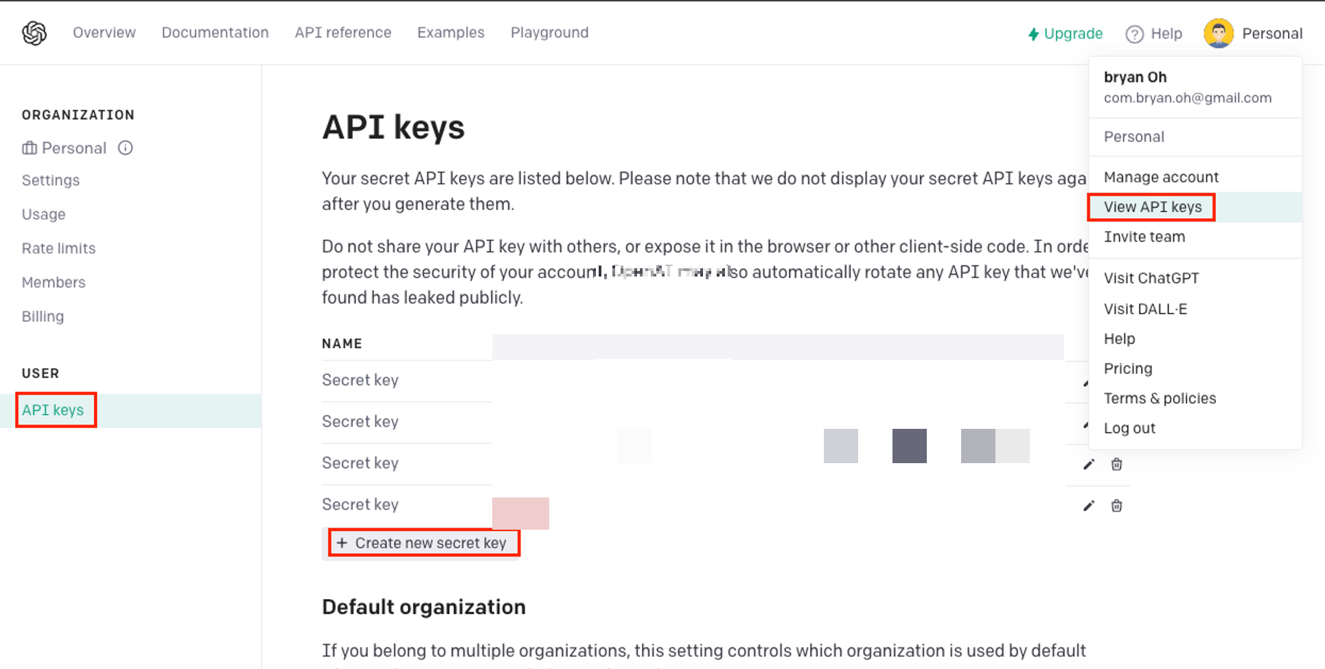 여기서 왼쪽 카테고리의 API Keys 접속 - Create new secret Key 클릭하면 됨!