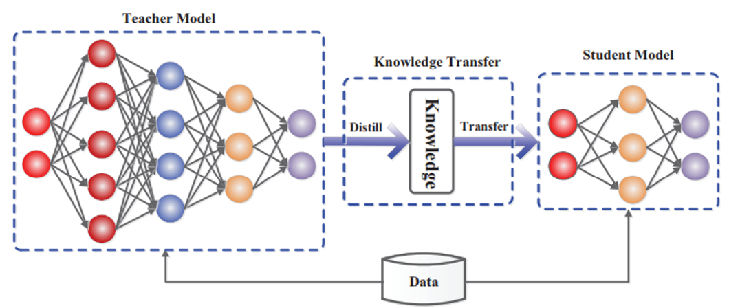 2015년부터 제안된 기법으로, 큰 teacher network 모델의 knowledge를 작은 student network로 전이하는 model compression 기법. Student network는 teacher network의 행동을 모방하도록 학습된다.