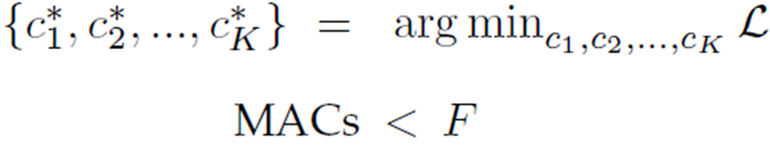 K 개의 channel로 pruning된다고 할 때, 모델의 목표는 가장 Loss를 최소화면서 computation cost가 F보다 작은 channel을 찾는 것이다. (F는 computation budget)