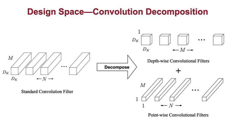 하지만 더 좋은 대안은 다음과 같은, depth wise, point wise convolution filters이다 (decomposed version of convolution)