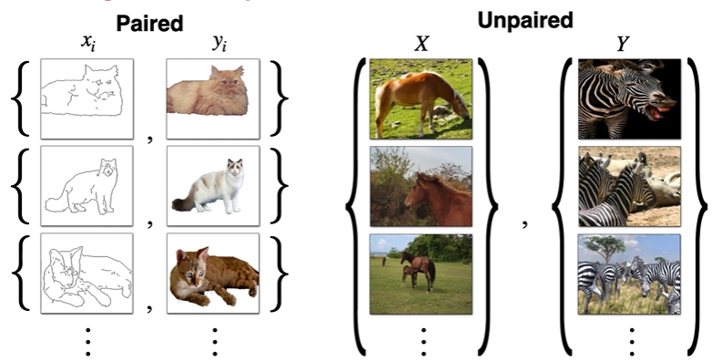 - Paired : Pix2Pix. train을 위한 groundtruth input-output pair가 있다. 예를 들어, 고양이 스케치에 대해서 groundtruth 고양이 이미지(y)를 가지고 있다.
