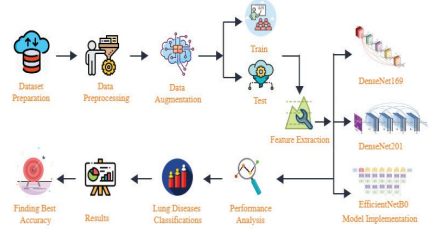 DNN은 흉부 엑스레이(CXR) 이미지에서도 가장 많이 사용되는 방법이고, 이는 위 3개 질병에도 동일하다. 이런 DNN을 평가하고자 Efficient - NETB0, DenseNet169, DenseNet201등을 비교하였다.