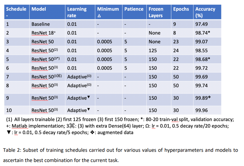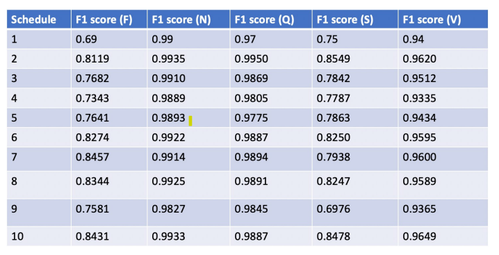 적혀 있듯이, 위 표는 현재 작업에 가장 적합한 조합을 확인하고자 수행된 훈련들의 집합이다. 각 스케쥴별로 비교했을 때, 각 스케쥴의 훈련 정확도는 비슷했으나 가장 우수한 것은 스케쥴 10이었다. 아래에 평가지표 결과가 있다.