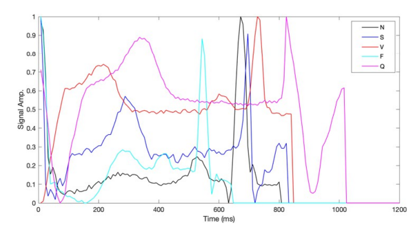 이 부정맥에는 비이소성(정상) / 상심실 / 심실 / 융합 / 알 수 없는 박동 등이 포함되어 있으며, 결과적으로 5개 파형 분류 및 정확도가 선행 연구에 비해 좋은 성능을 보인 바 있다.